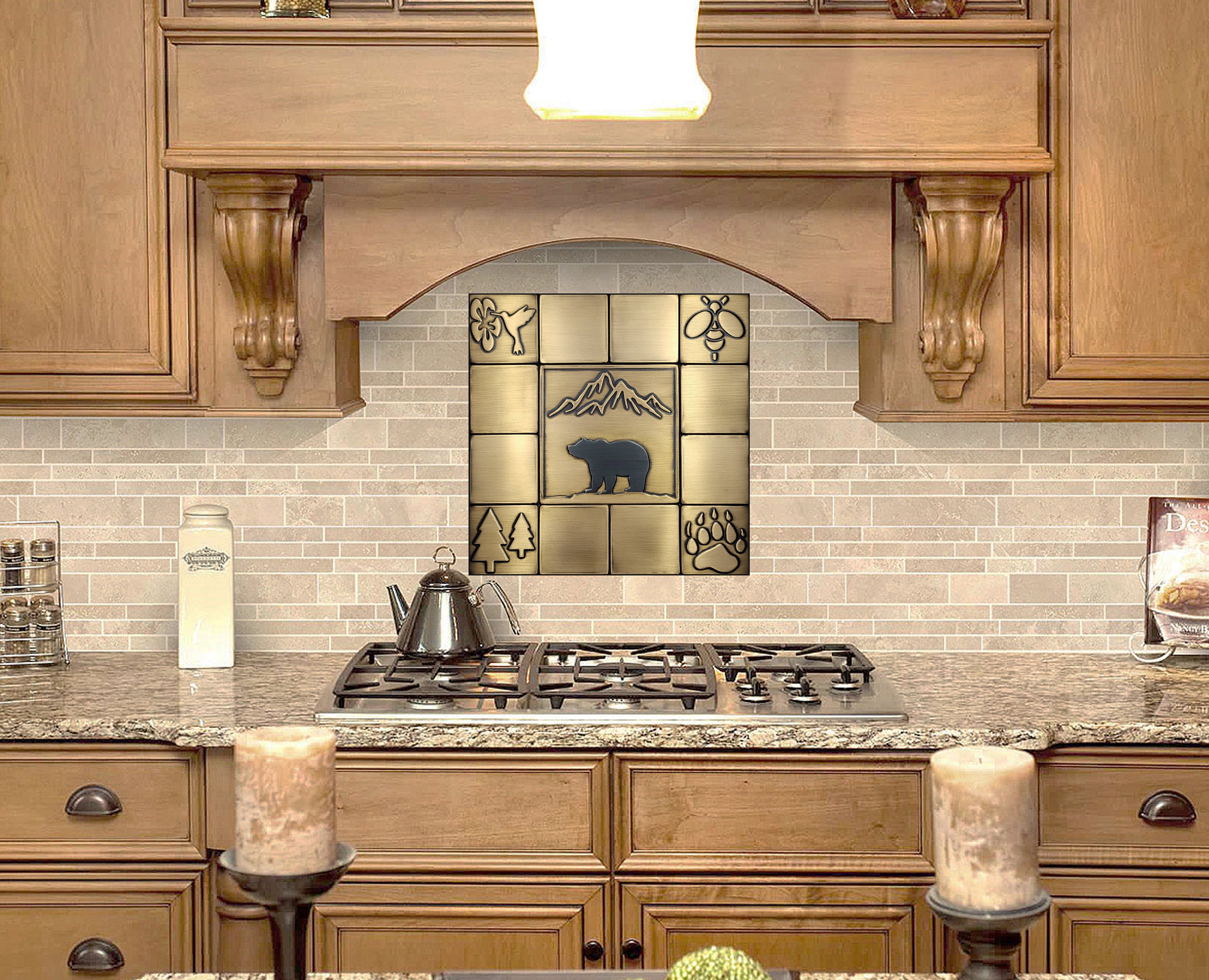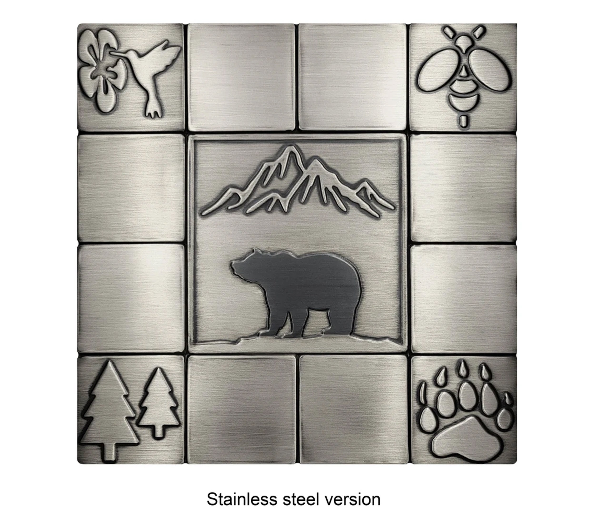 Bear and mountains - Set of 13 Handmade tiles - 100% Copper, Stainless Steel or Brass. The perfect backsplash for bear lovers.