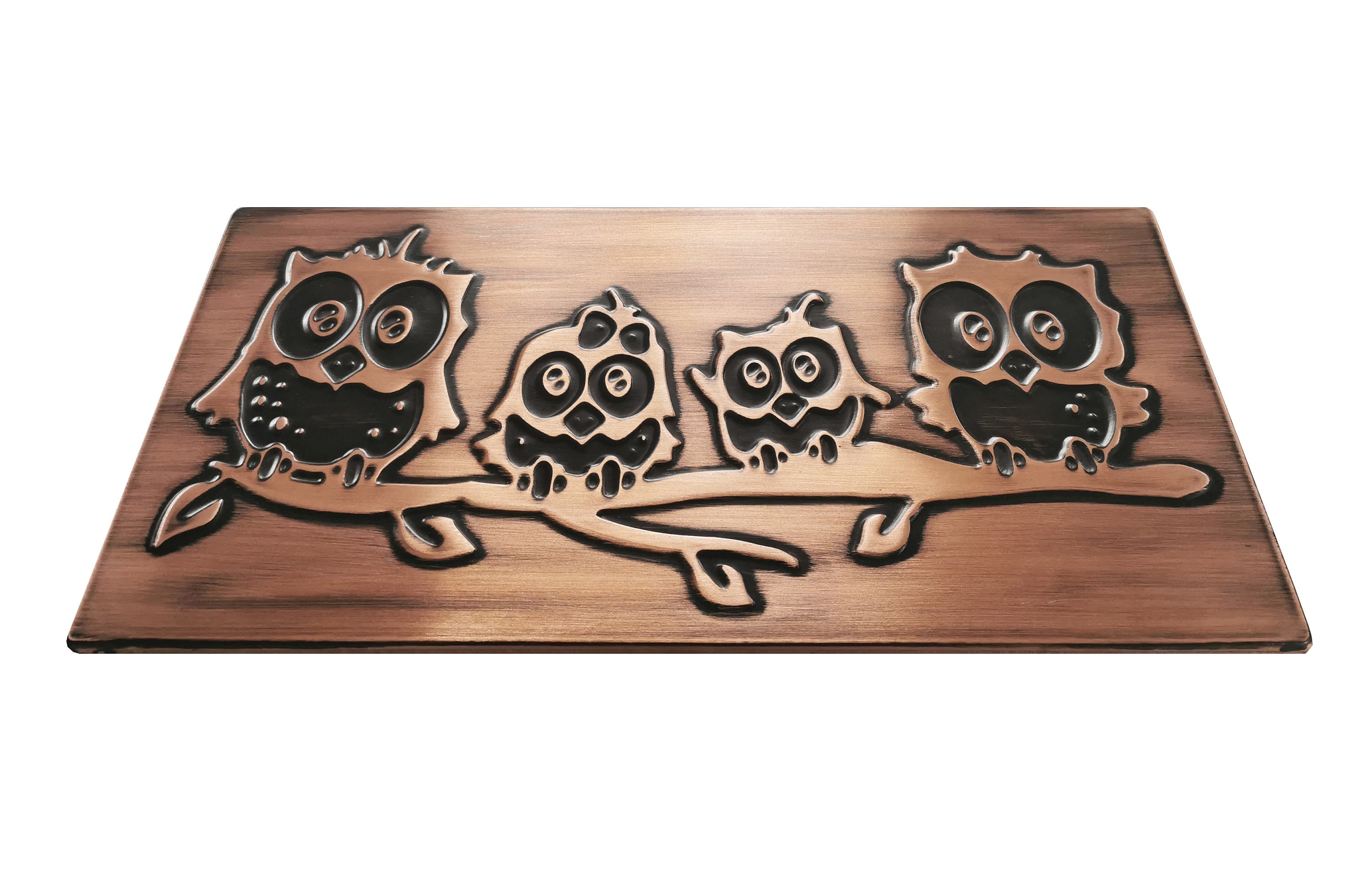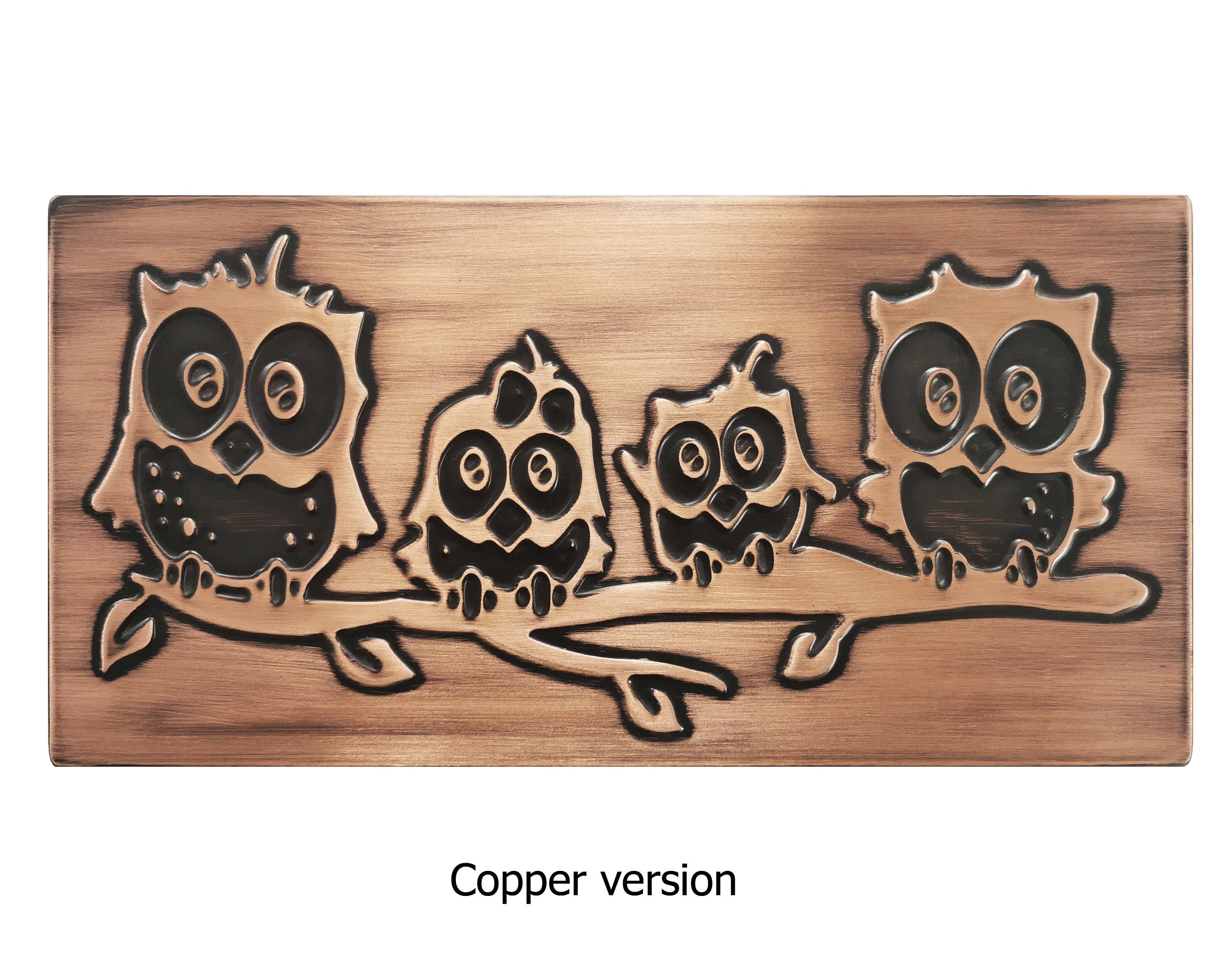Owl Family Metal Wall Art β Handmade Copper or Steel Tile β Cute Owl Backsplash for Kitchen β Rustic Gift for Bird or Nature Lovers