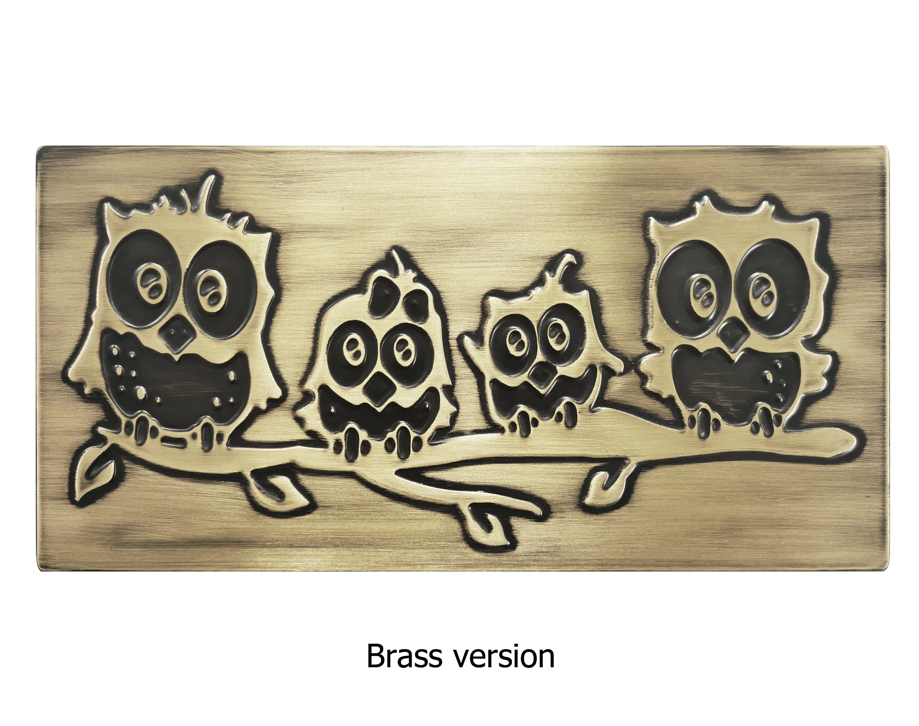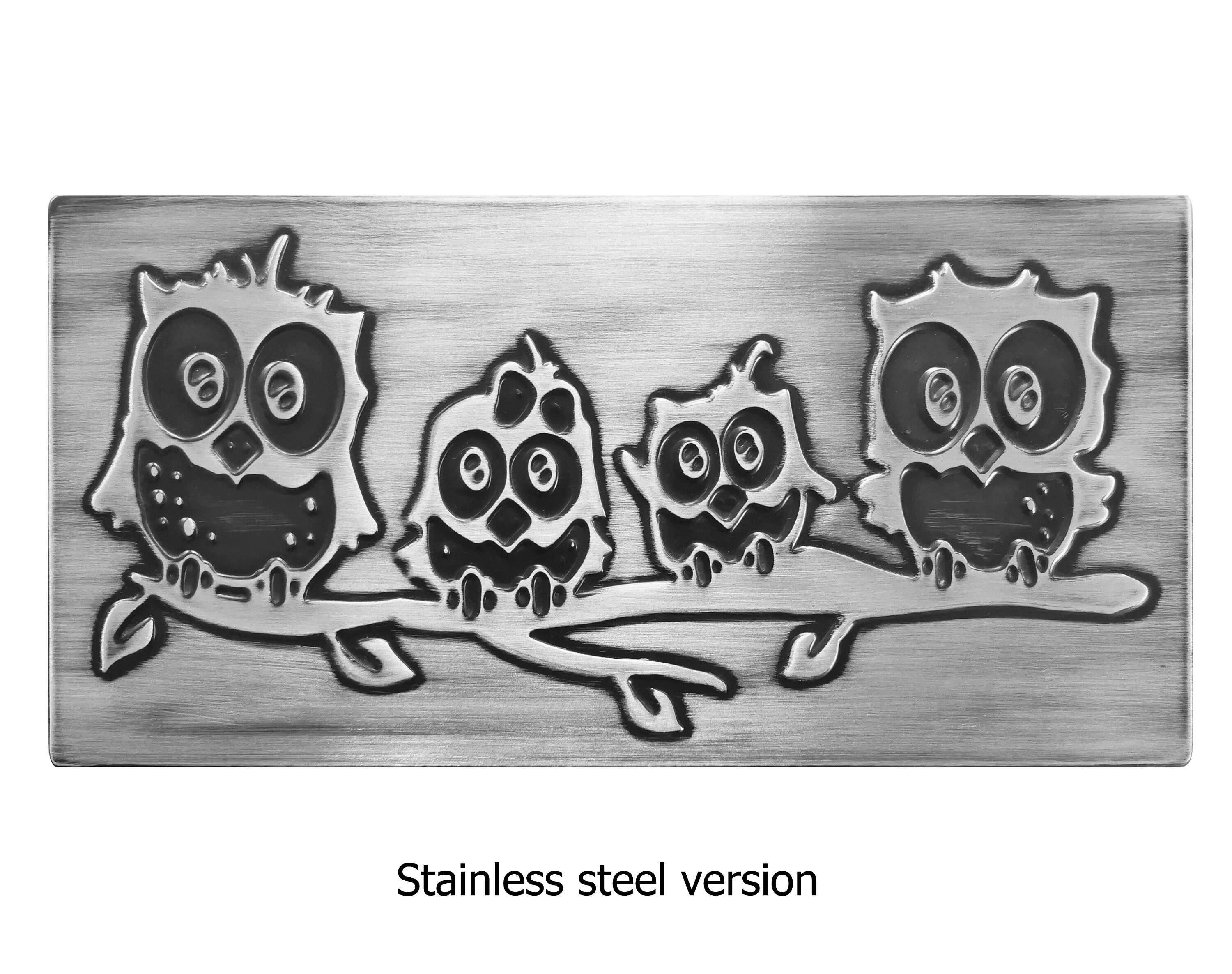 A charming family of owls perched on a branch β this engraved tile brings a warm, playful touch to your kitchen or living space. Handcrafted from copper, stainless steel, or brass, itβs a wonderful gift idea for bird lovers, moms, or anyone who loves rustic woodland style.