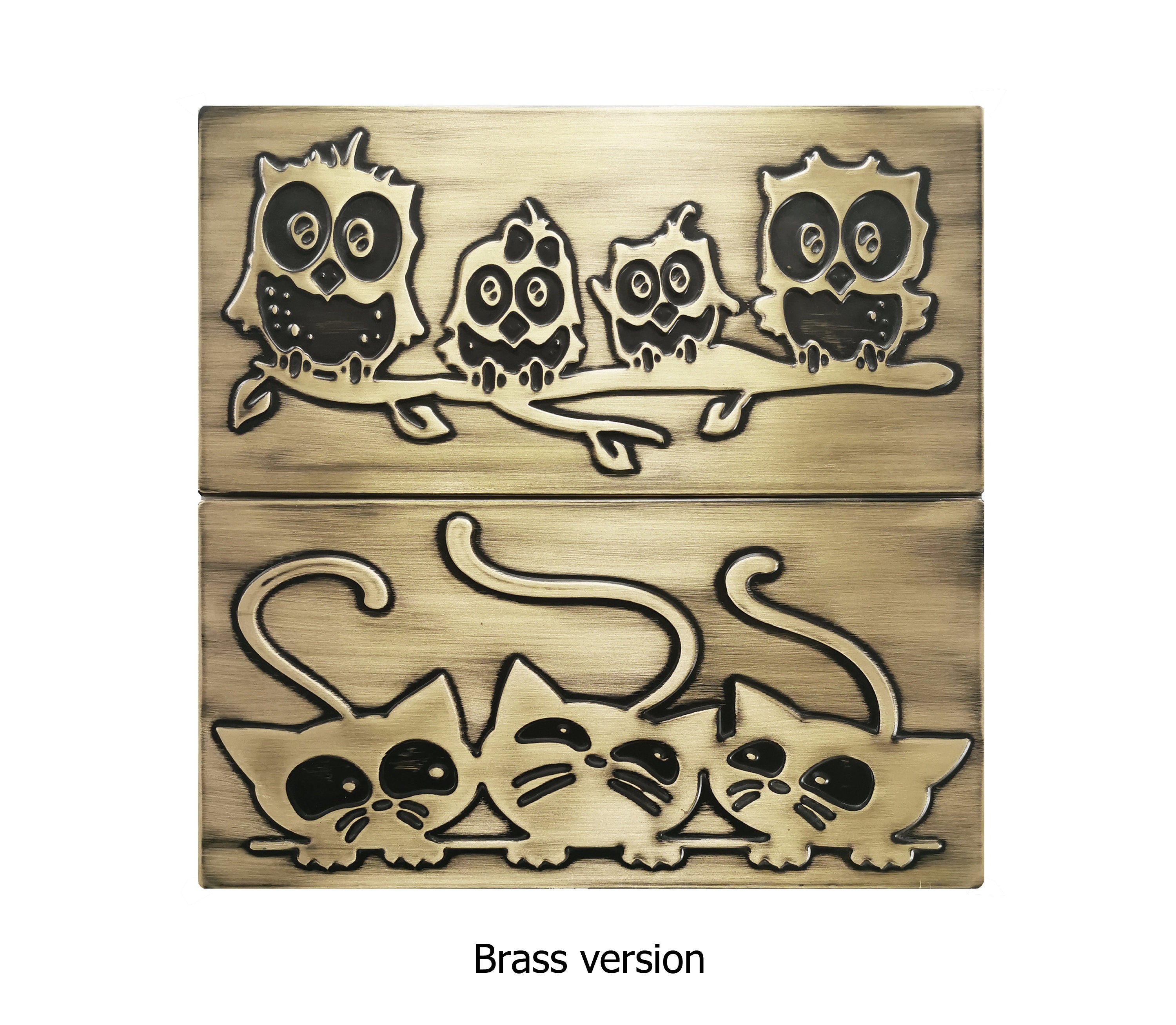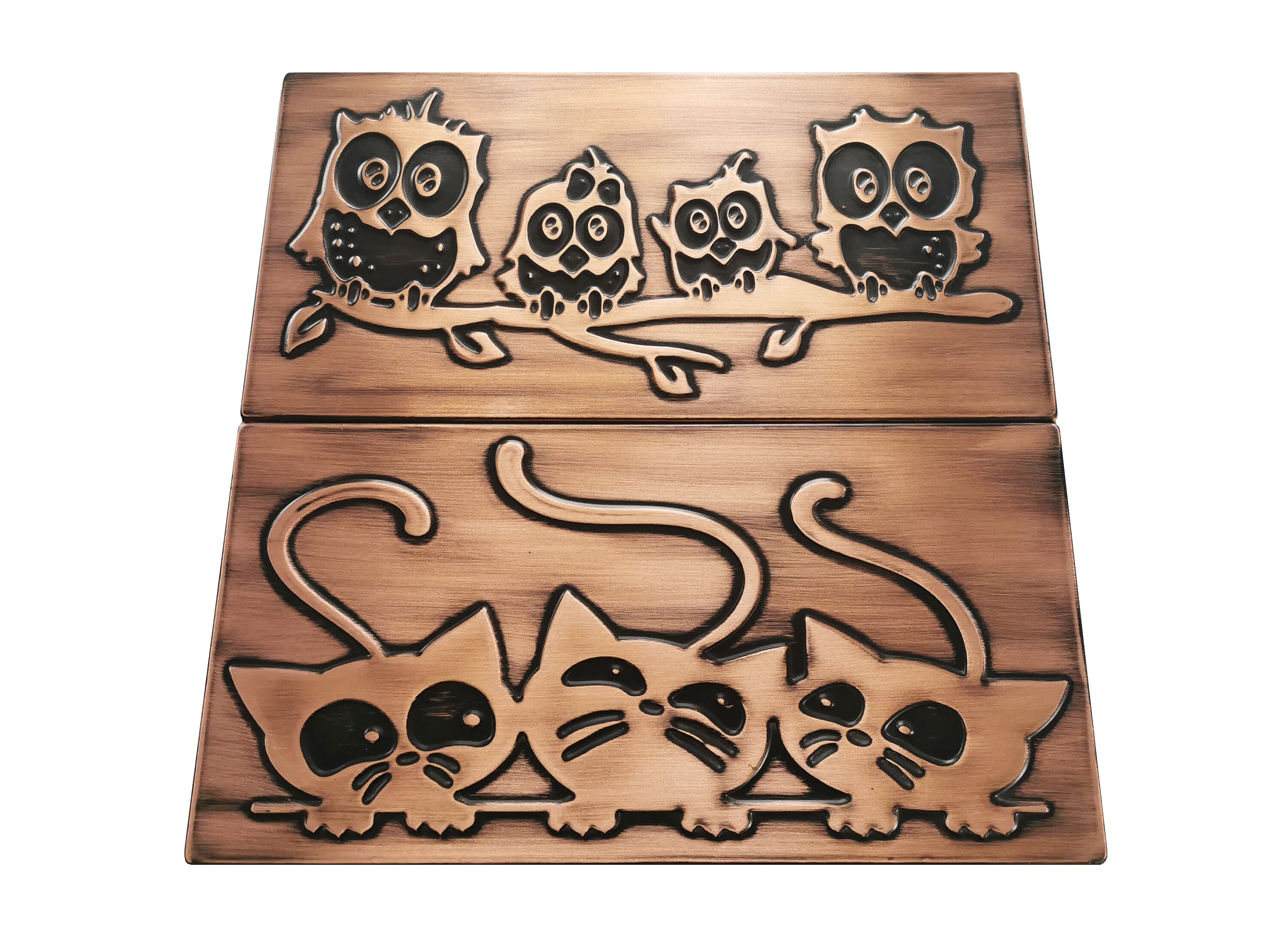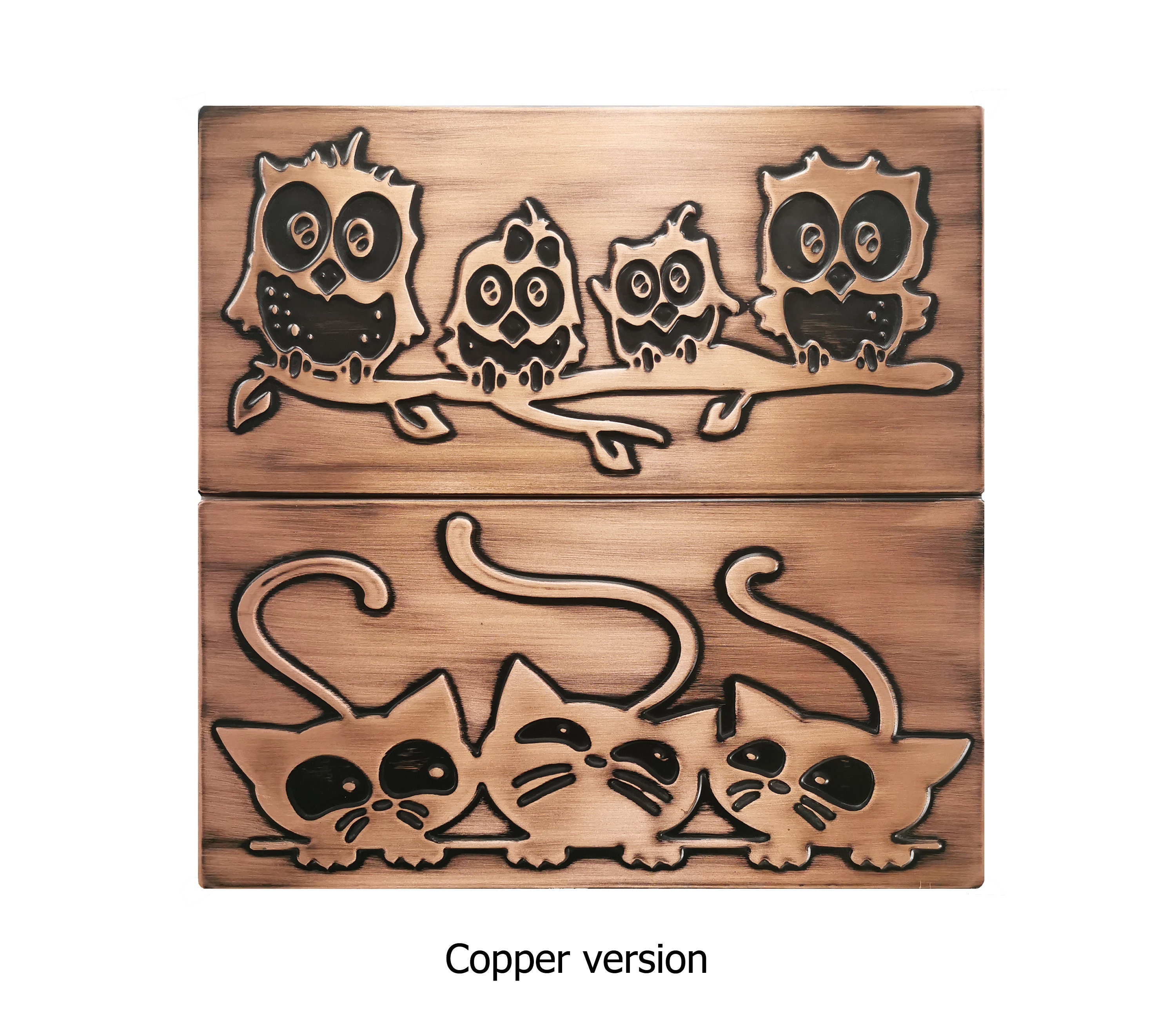 Family of owls on a branch and cats. Set of 2 handmade tiles - 100% Copper, Stainless Steel or Brass. The perfect tiles for owl lovers.