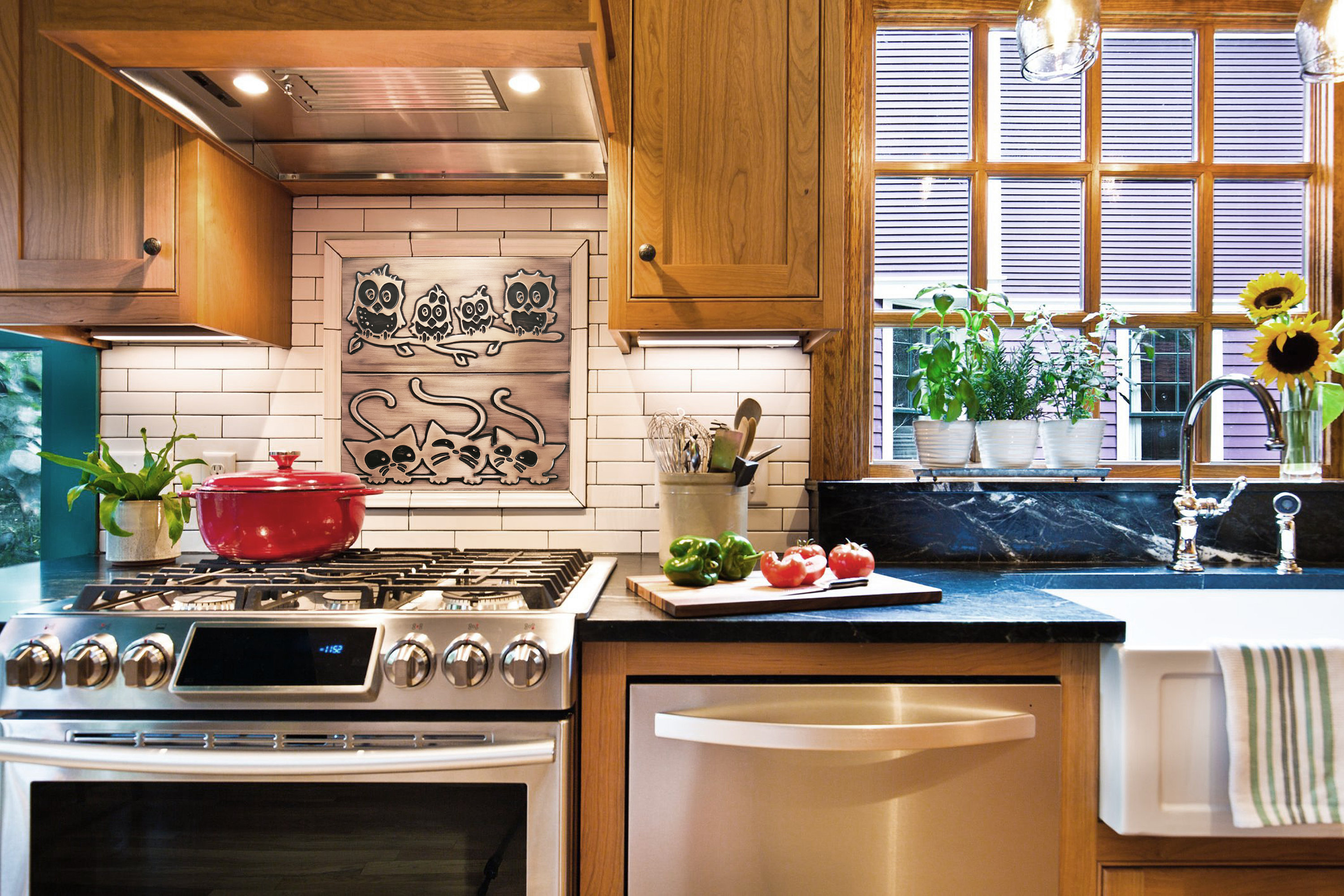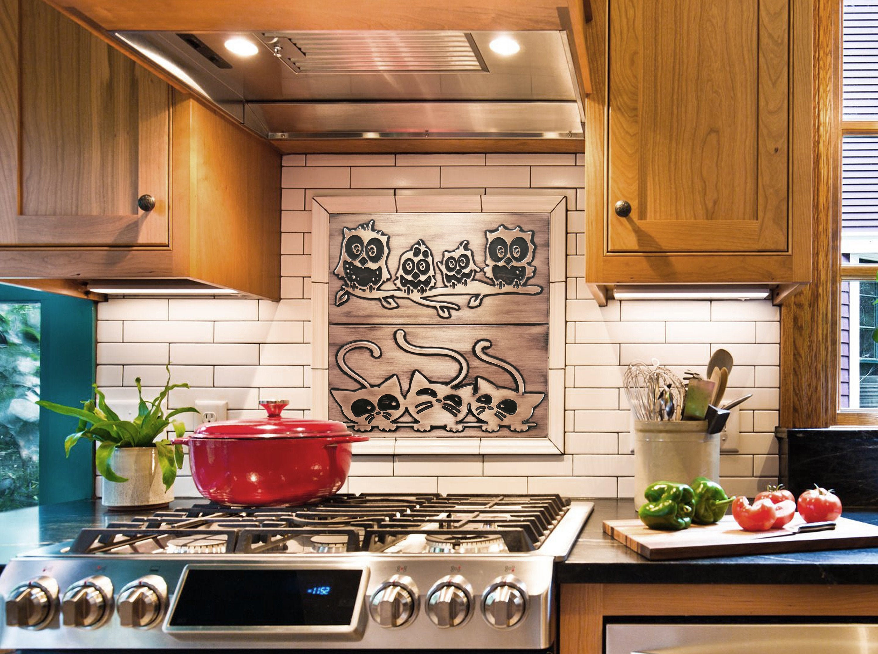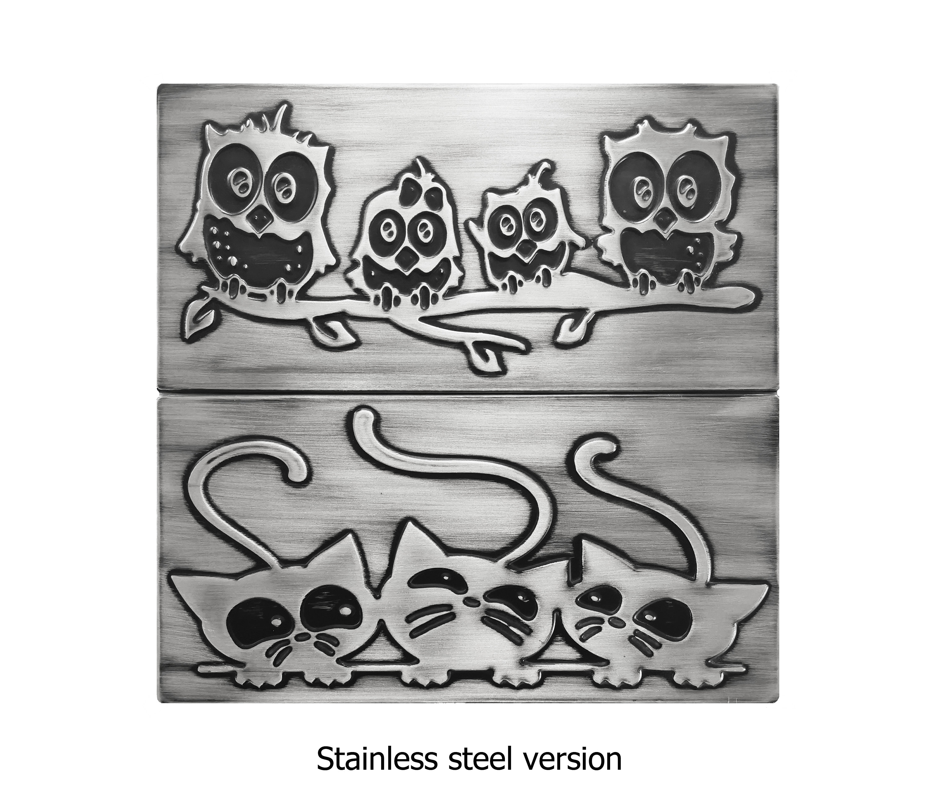 Family of owls on a branch and cats. Set of 2 handmade tiles - 100% Copper, Stainless Steel or Brass. The perfect tiles for owl lovers.