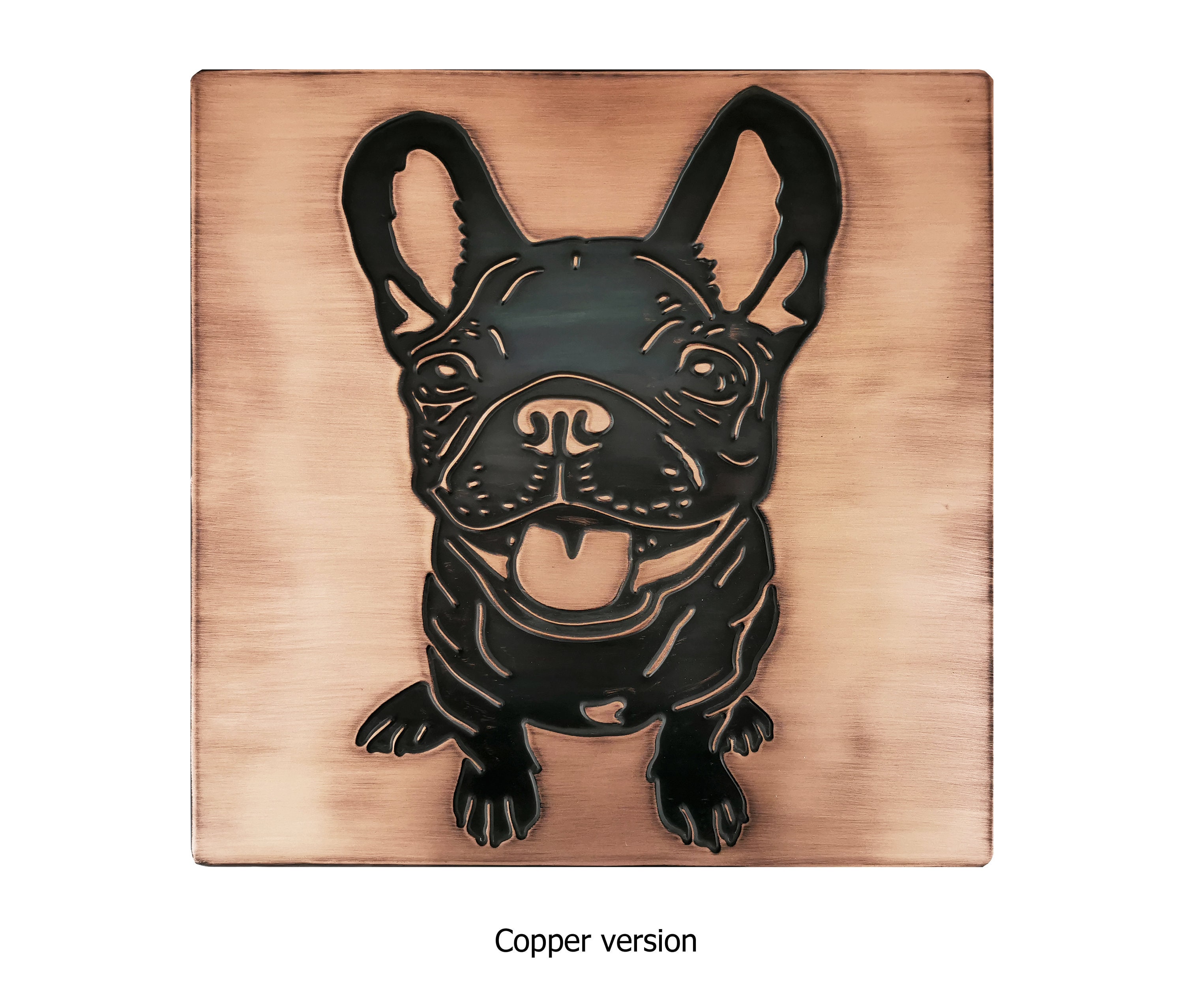 Step into the world of artistic craftsmanship and creative ingenuity, where the masterful hands of Leon bring forth enchanting treasures that redefine the essence of beauty. Nestled within the heart of our Etsy shop is a realm where raw materials metamorphose into exquisite creations, each a testament to Leon's dedication and passion. Allow us to unveil a true masterpiece: the Handmade Square Wall Tile, an endearing portrayal of a French Bulldog, capturing the essence of this beloved breed in a stunning piece of metal art.