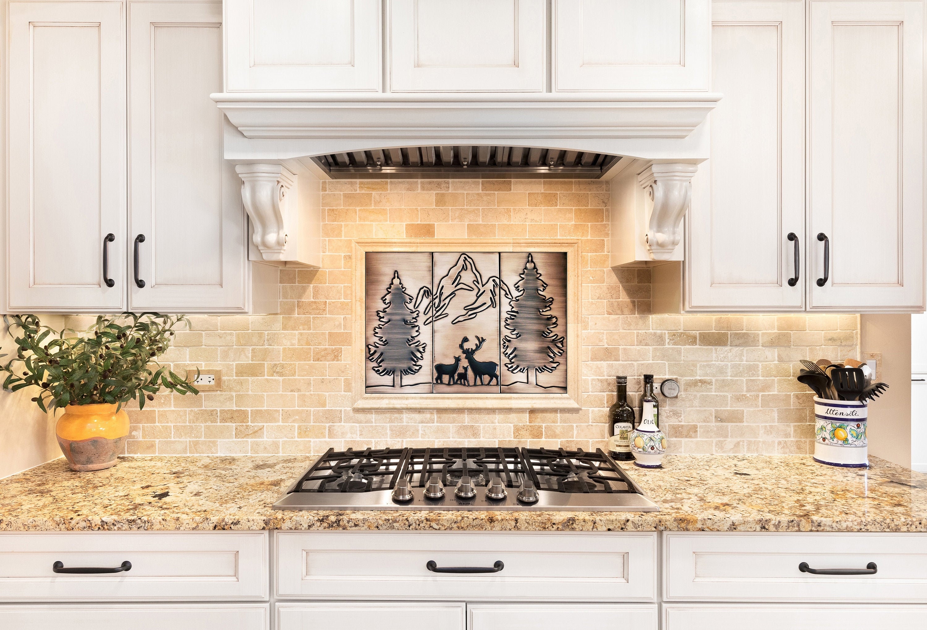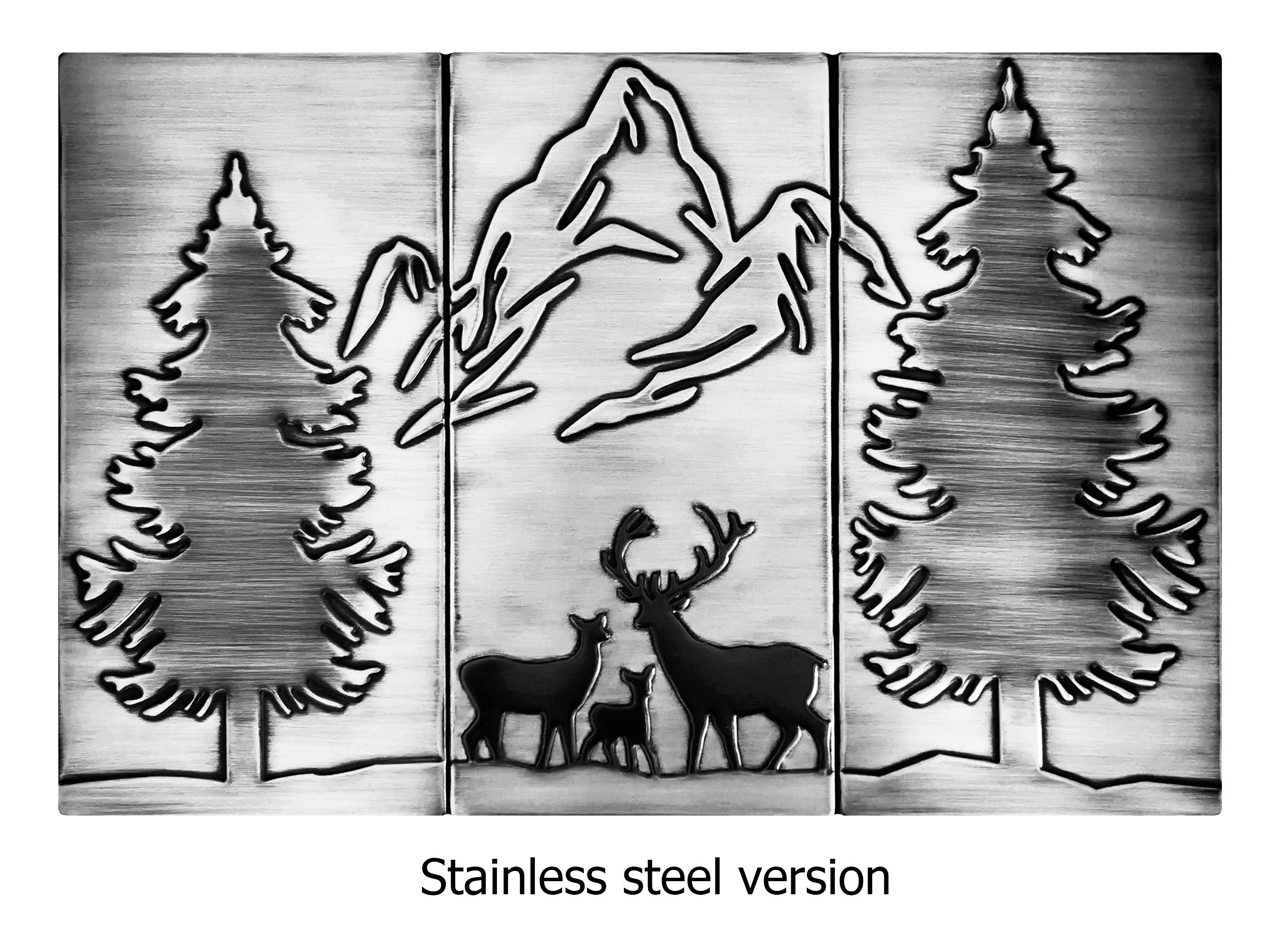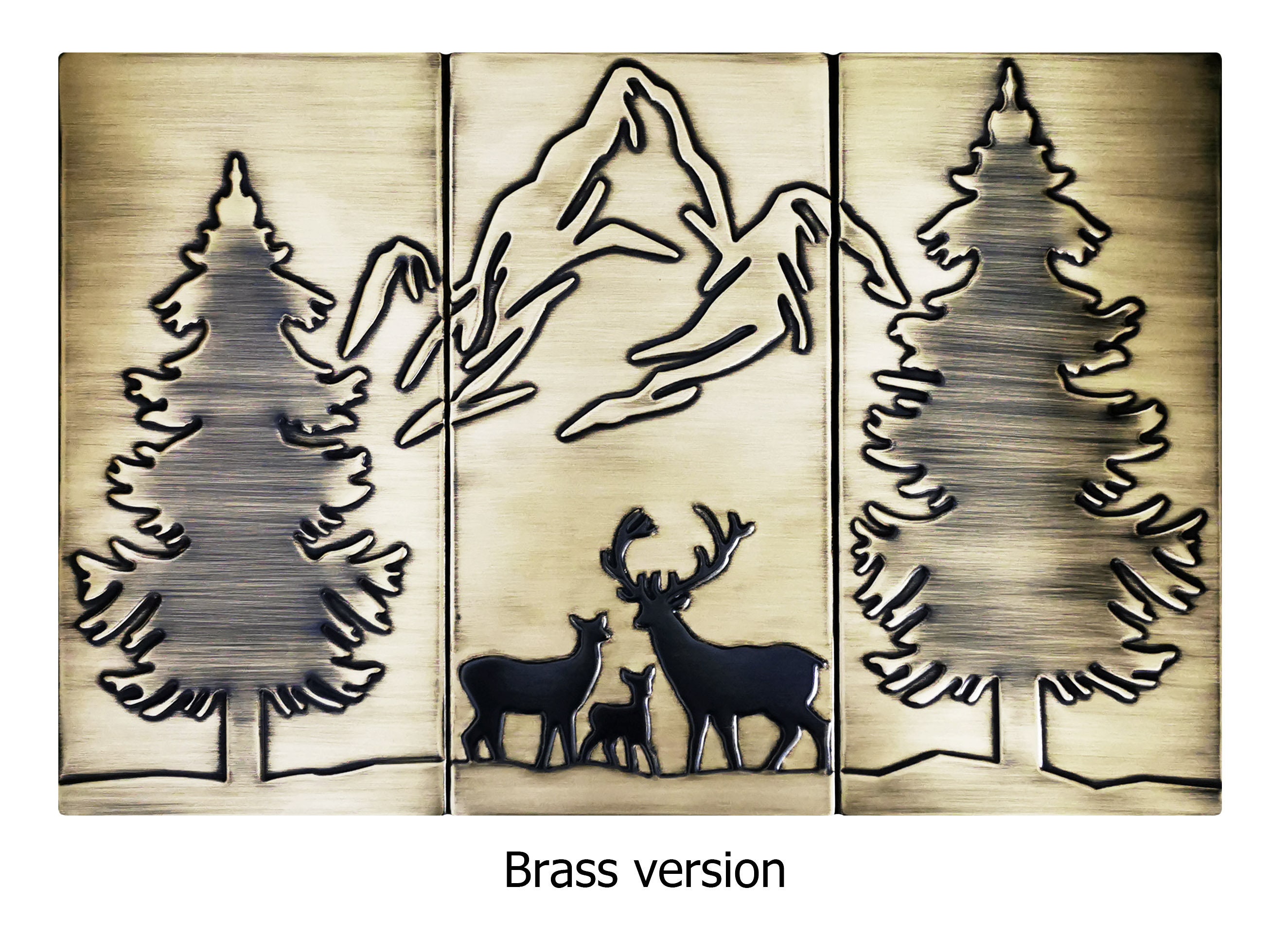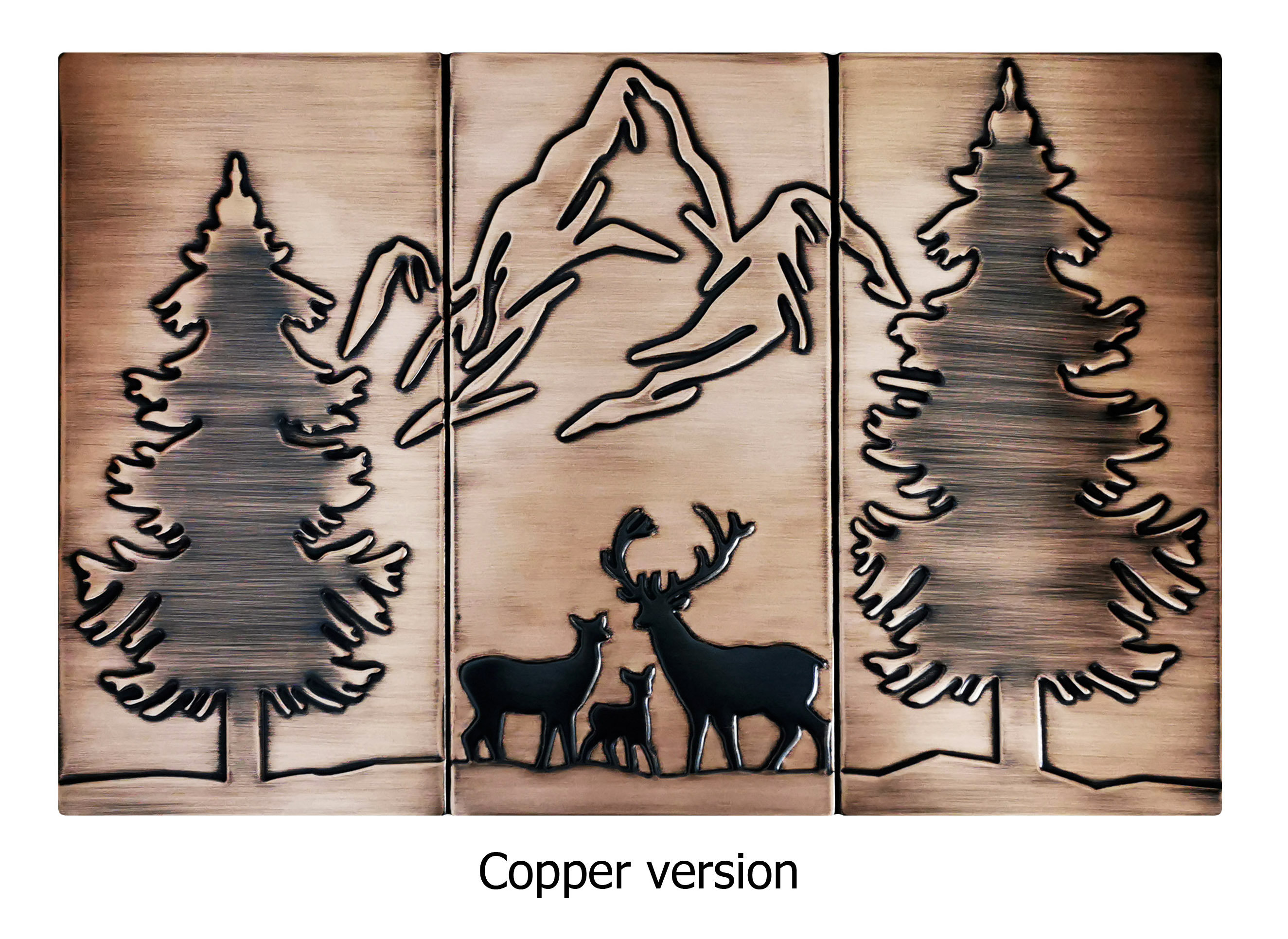 Happy deer family in the forest and mountains - beautiful set of 3 Handmade tiles - 100% Copper, Stainless Steel or Brass.
