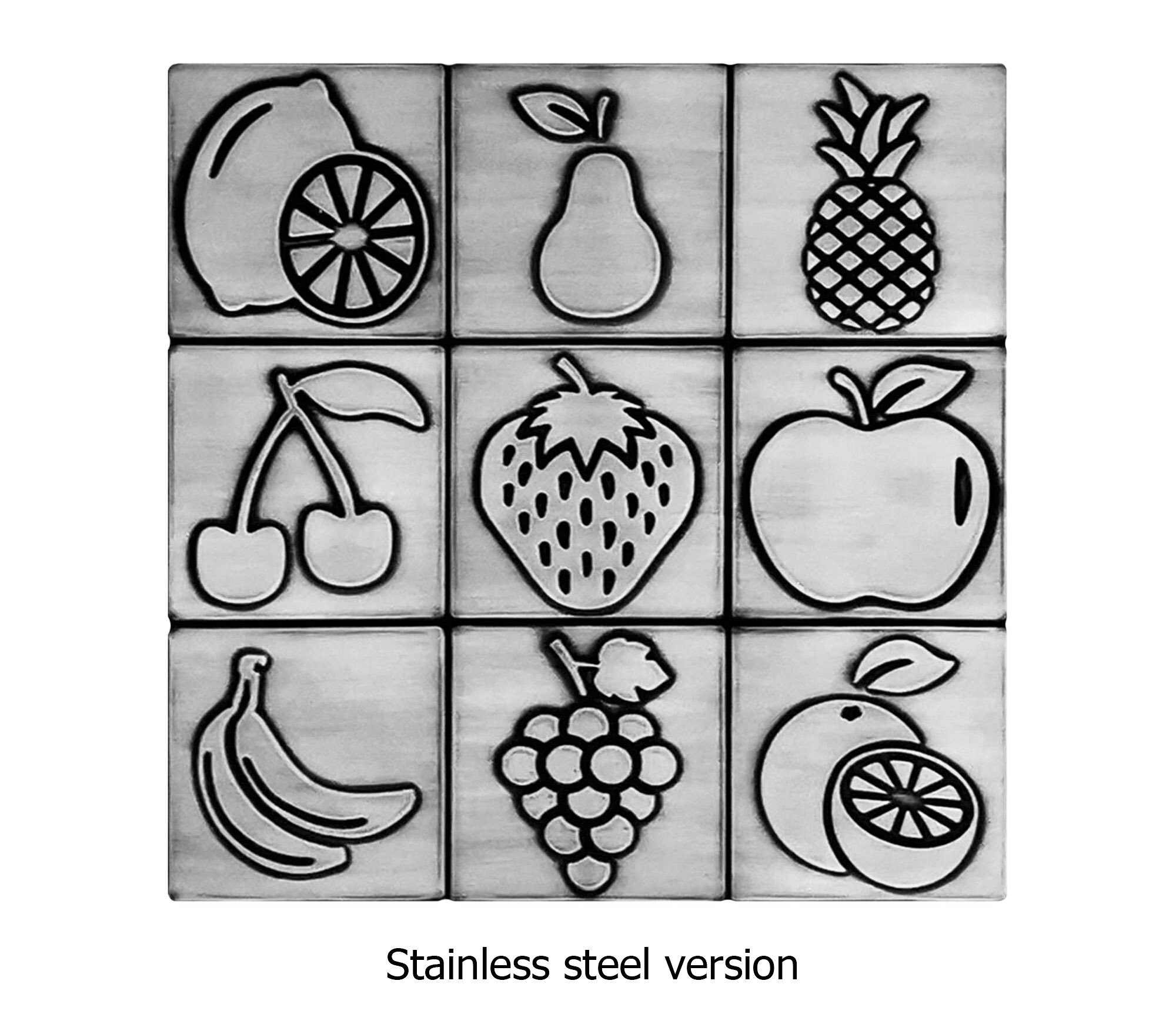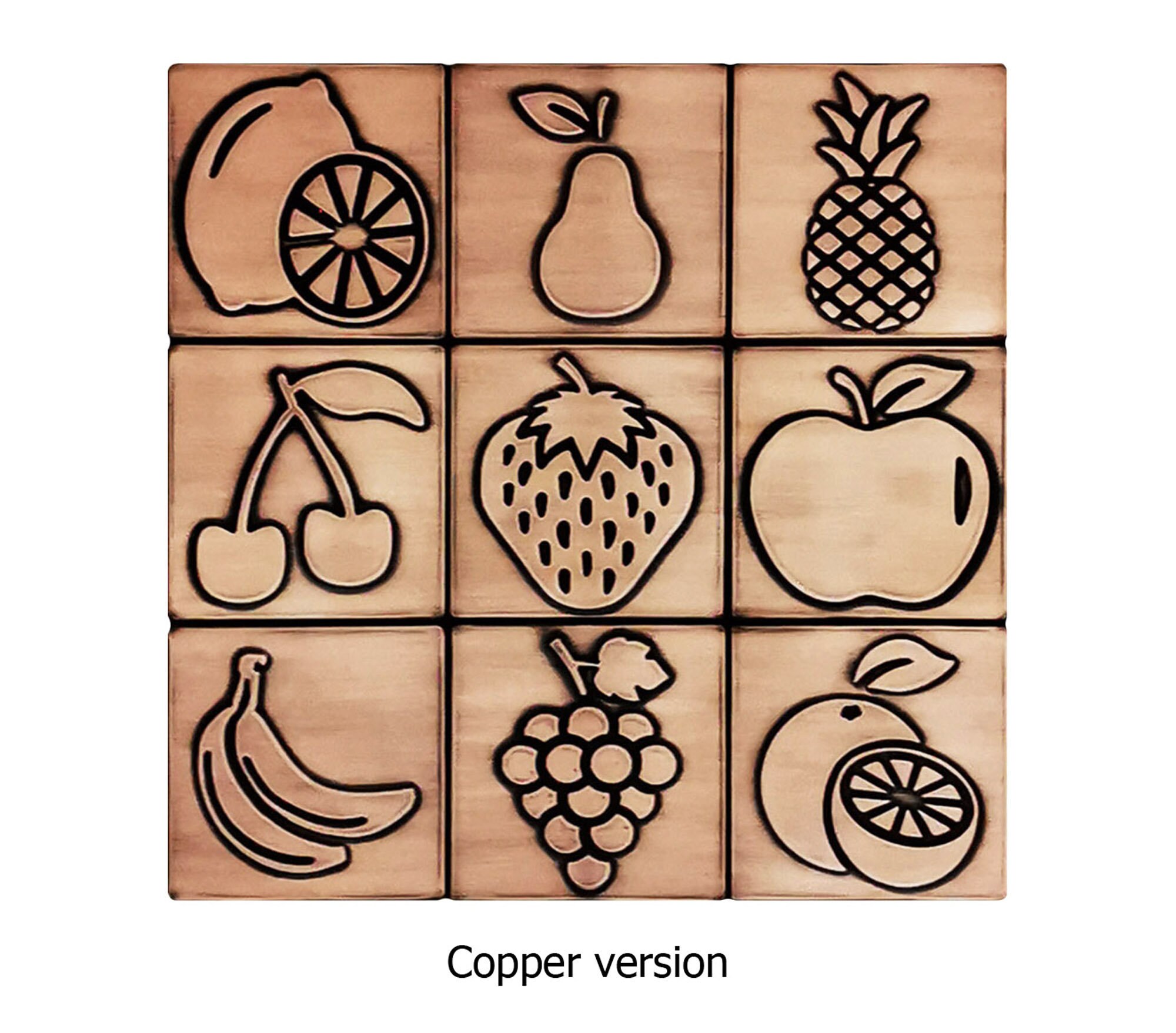 Fruits - Set of 9 Handmade tiles - 100% Brass, Copper or Stainless Steel. The sweetest, beautiful backsplash.